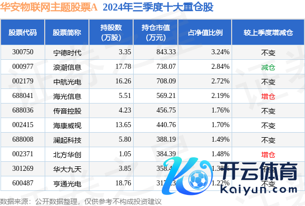 华安物联网主题股票A为股票型基金,笔据最新一期基金季报显现,该基金财富设立:股票占净值比94.81%,债券占净值比0.45%,现款占净值比4.67%。基金十大重仓股如下: