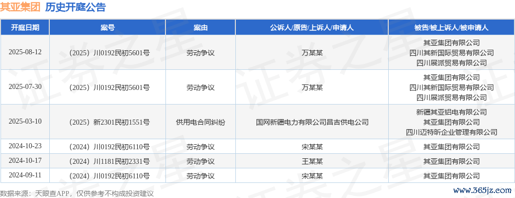 案号:(2025)川0192民初5601号审理法院:四川天府新区成王人片区东说念主民法院案由:工作争议当事东说念主信息: 原告/上诉东说念主:万某某 被告/被上诉东说念主:其亚集团有限公司、四川其新外洋买卖有限公司、四川展派买卖有限公司开庭日历:2025年8月12日阐明统计,近一年内以其亚集团有限公司为当事东说念主的历史开庭公告有6则,其中案由为“工作争议”的公告以5则居首,其次为“供用电公约纠纷”有1则。历史开庭公告如下: