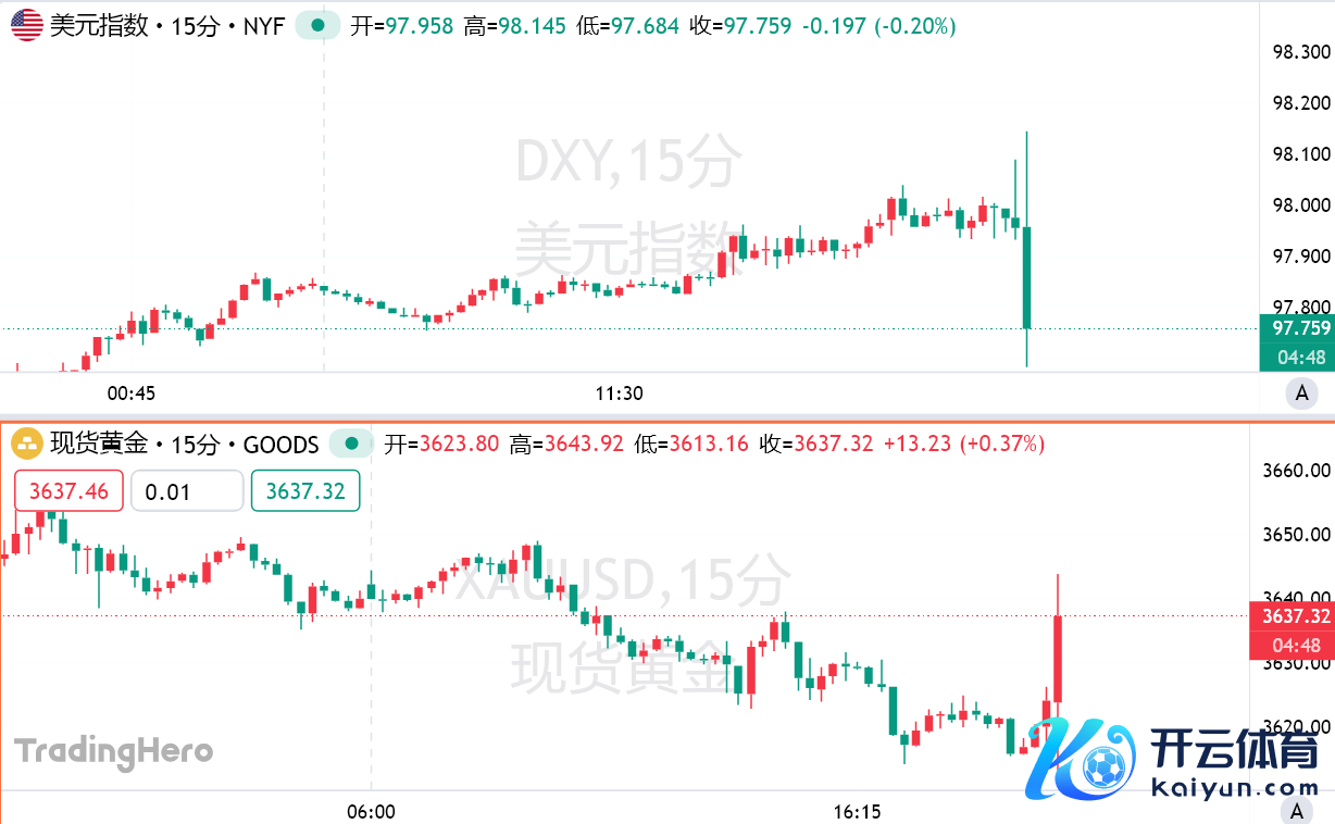 数据公布后,好意思元指数短线下挫30余点。现货黄金抓续拉升,短线涨幅扩大至近30好意思元,一度重回3640好意思元/盎司上方。