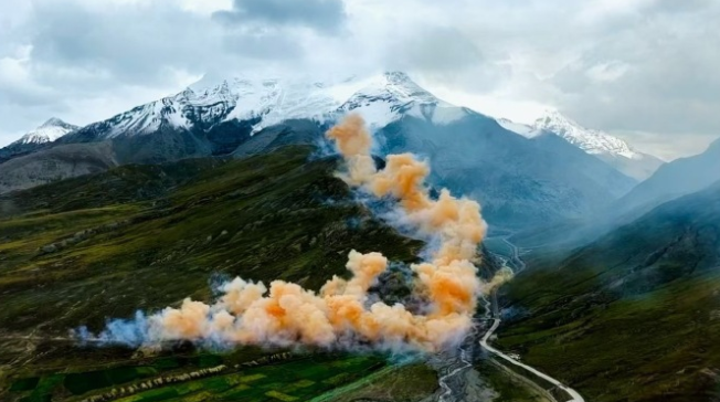 当日傍晚,蔡国强在西藏喜马拉雅山脉江孜热龙地区(海拔约5500米)启动燃放艺术烟花。